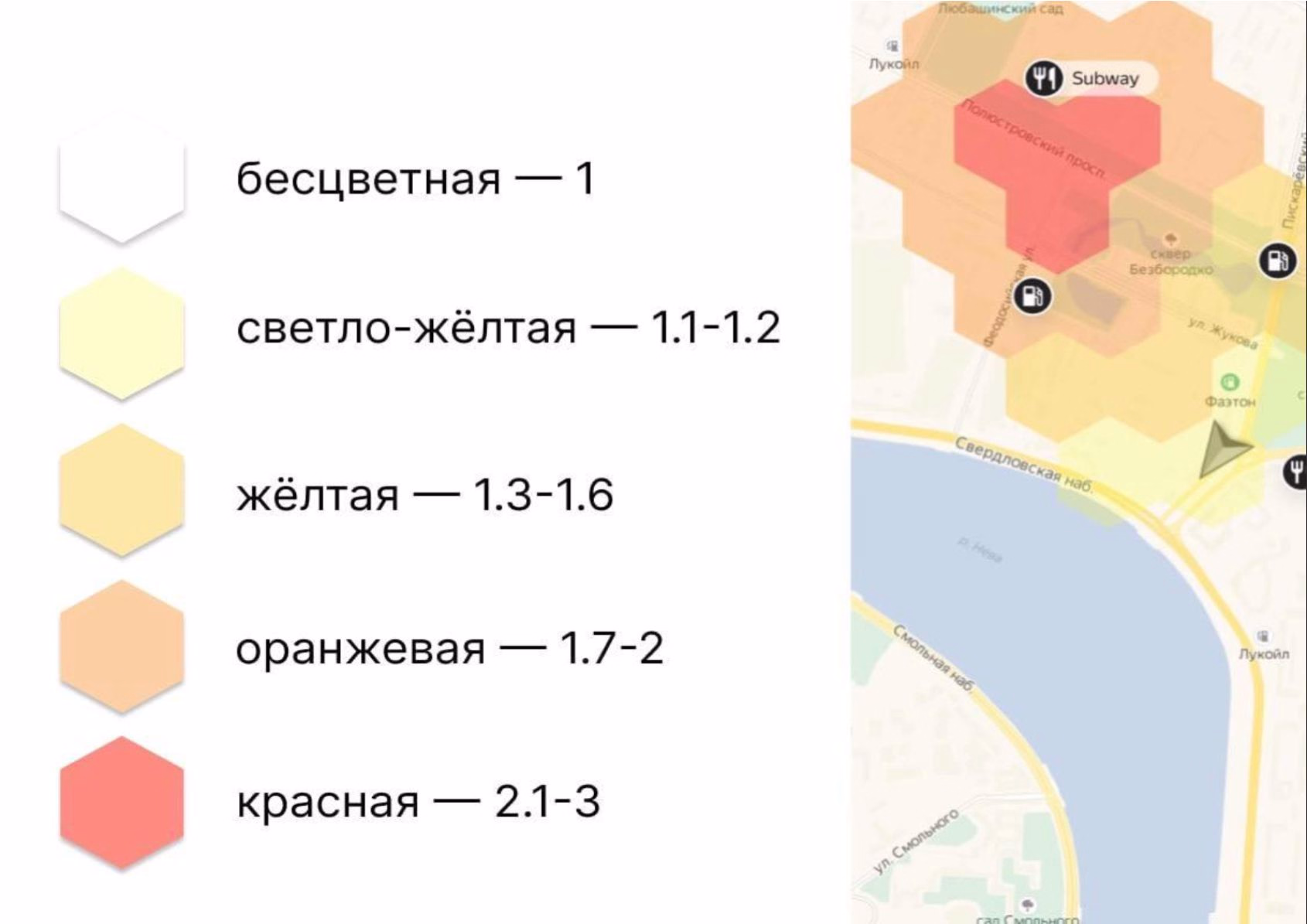 • В каждой зоне есть коэффициент спроса — на него умножаем плату за маршрут. Зависит от количества заказов на локации и варьируется от 1 до 3 (без учёта дополнительного коэффициента).